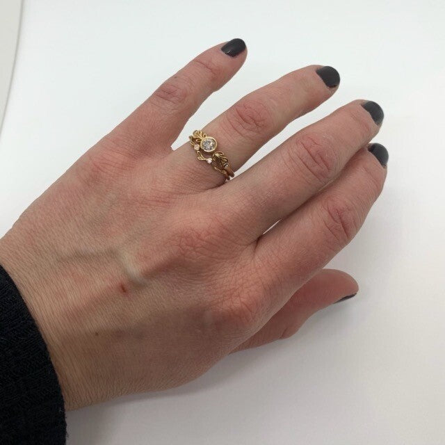 18k rose gold "Marina" ring with round brilliant cut white diamond center flanked beautiful leaf detail and diamond accents.