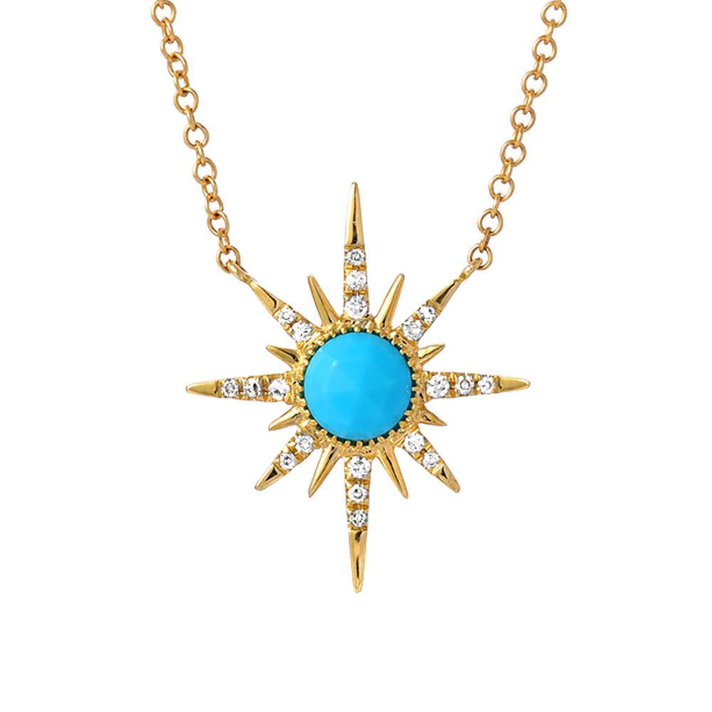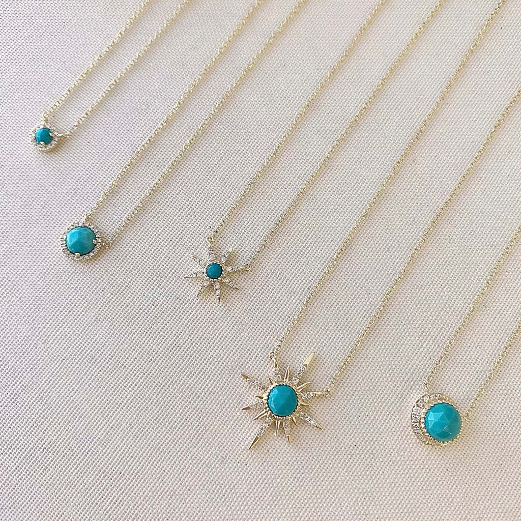 14k gold necklace with a rose cut turquoise with a diamond adorned starburst halo