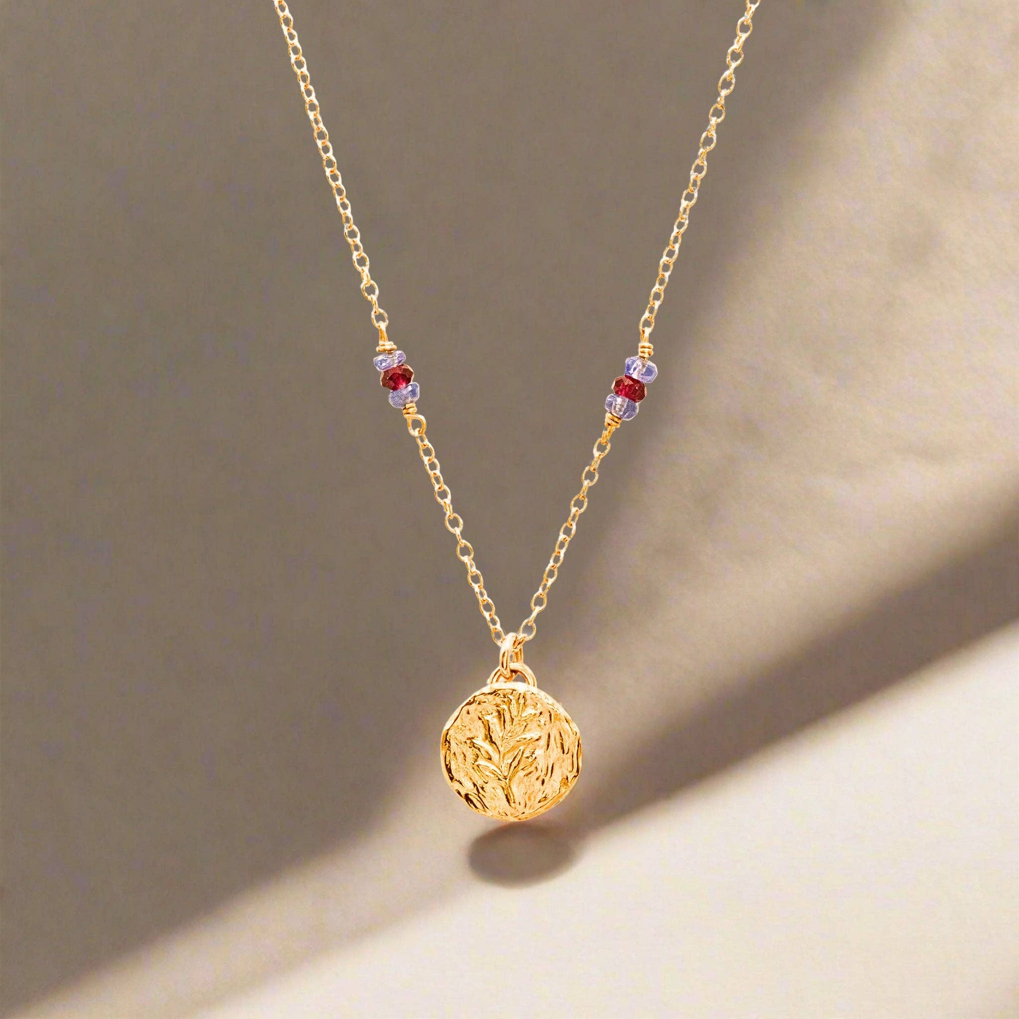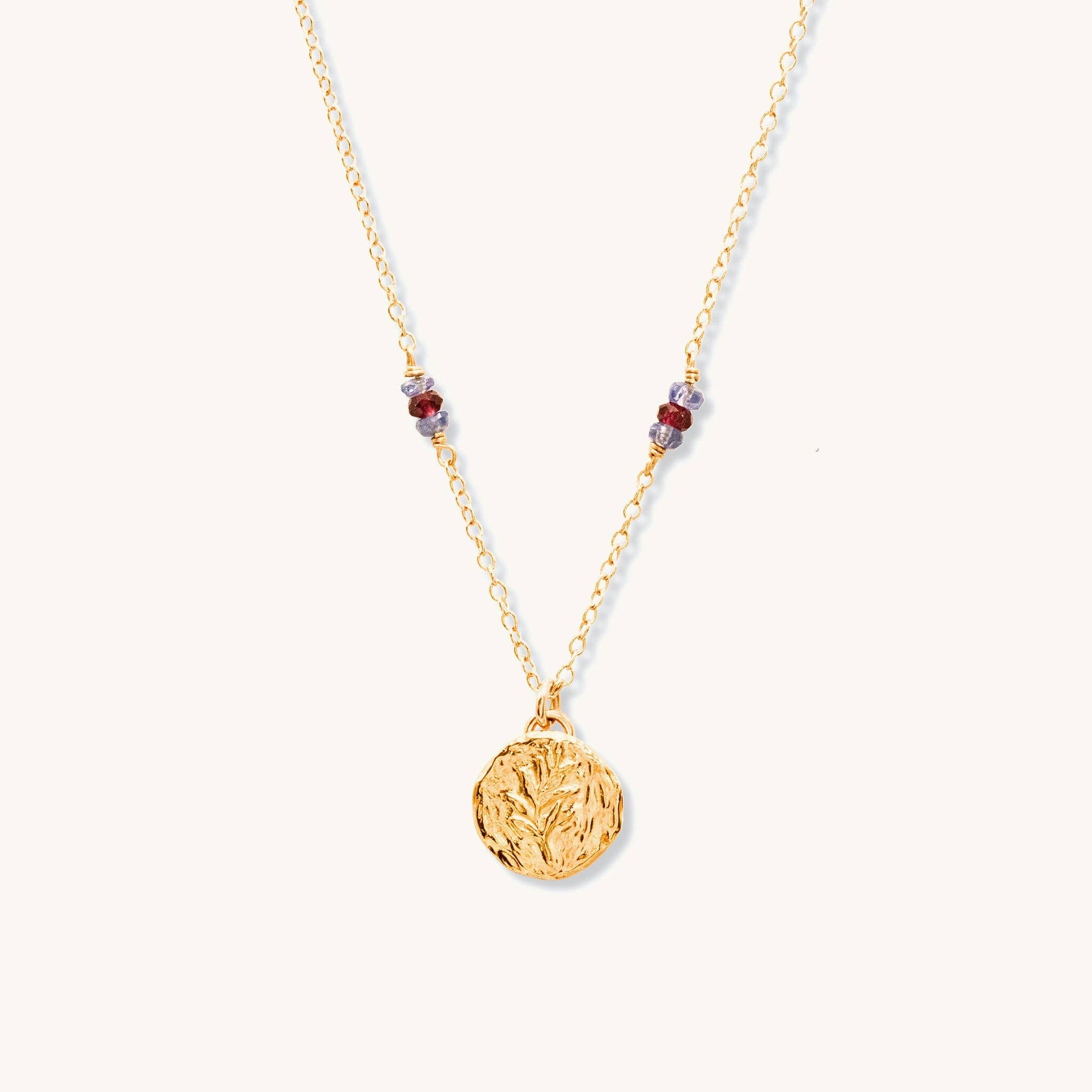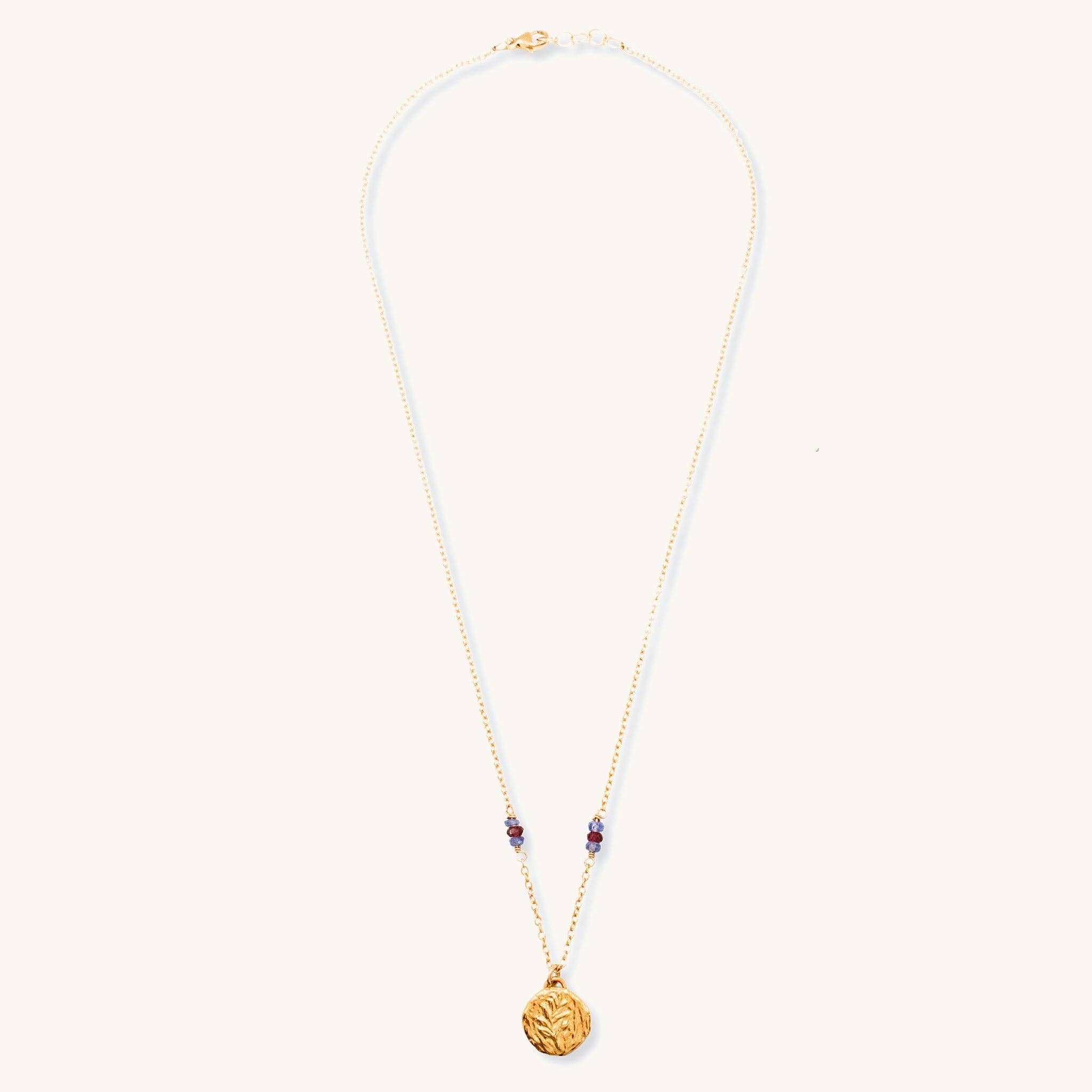 This elegant 1/2" round vermeil pendant features an intricate fern design, enhanced with tanzanite and rhodolite accents. Suspended on a 16" 14k gold-filled chain with a 1" adjustable extender and lobster clasp, it is a versatile, nature-inspired piece perfect for everyday wear.