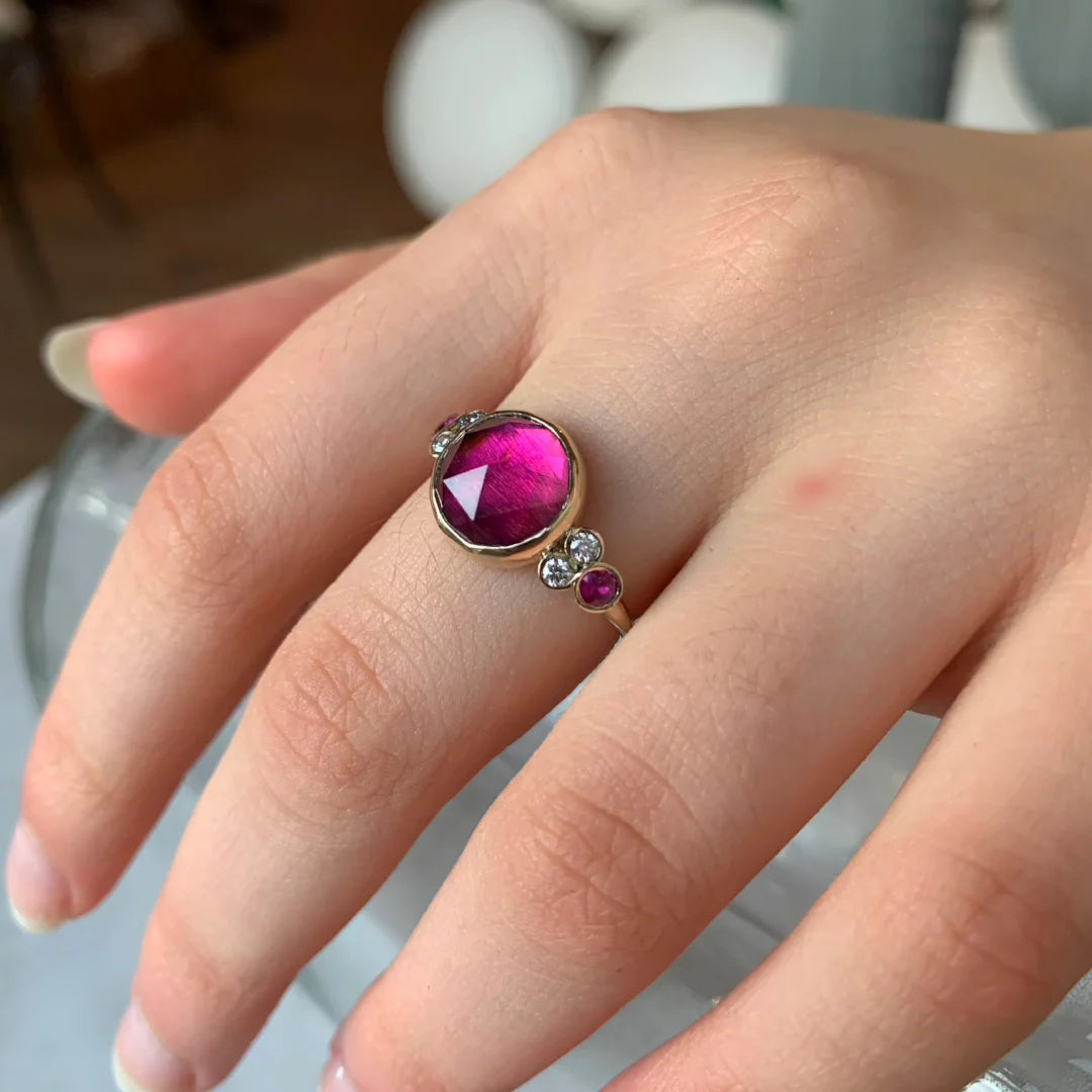 - Diamond and Pink Sapphire cluster accents