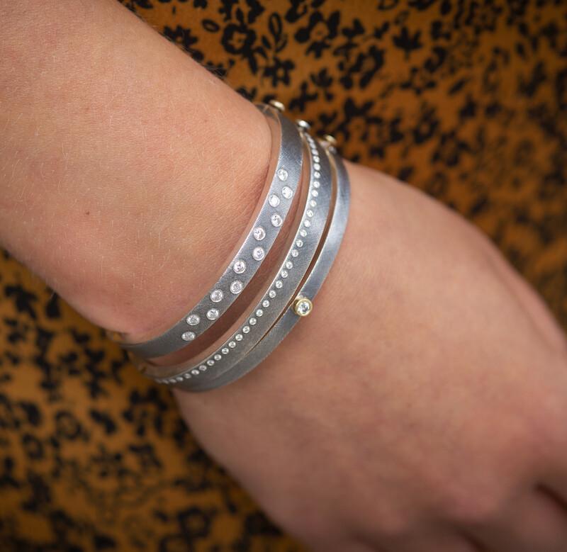 - Sterling silver and oxidized sterling silver bangle with a single white diamond bezel set in 18k yellow gold