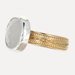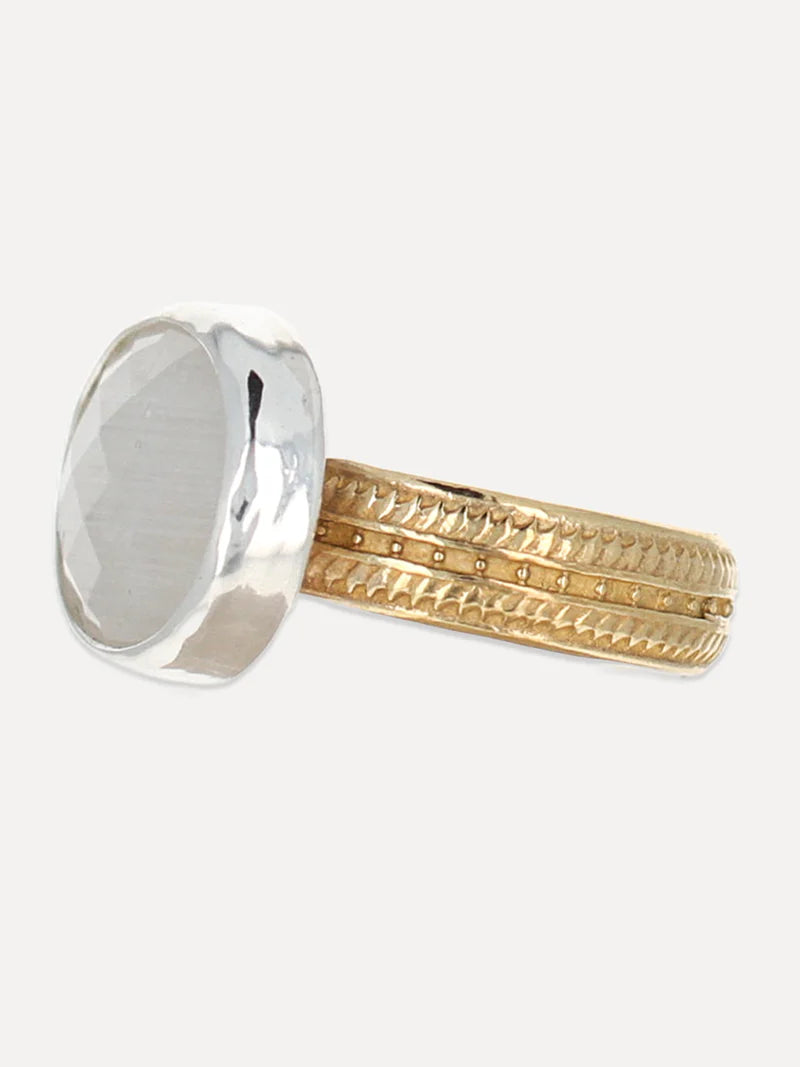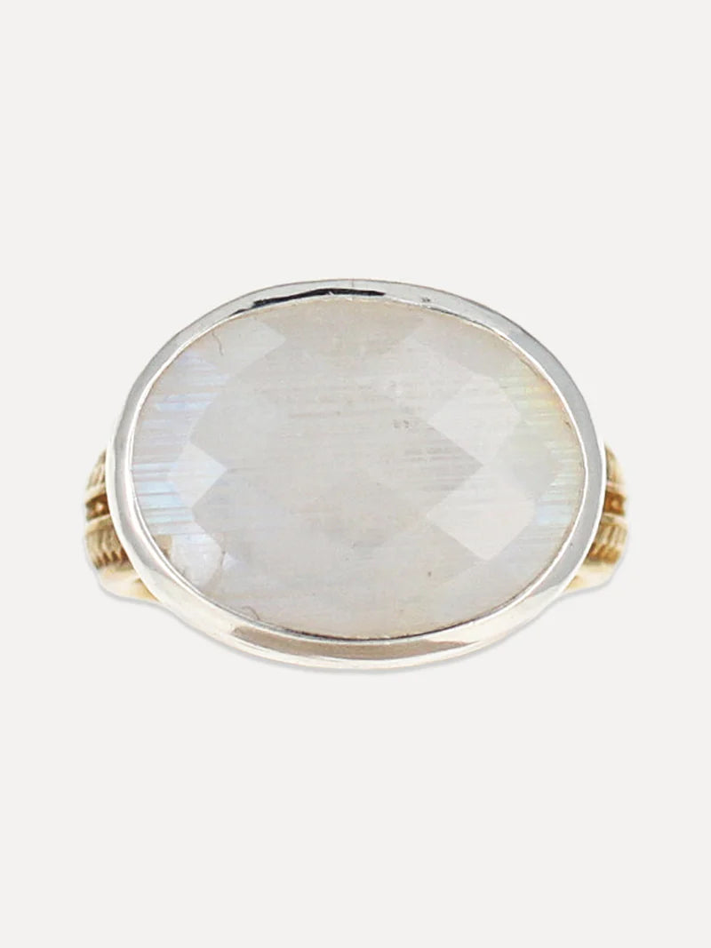 - Faceted oval-shaped moonstone gemstone set with sterling silver bezel