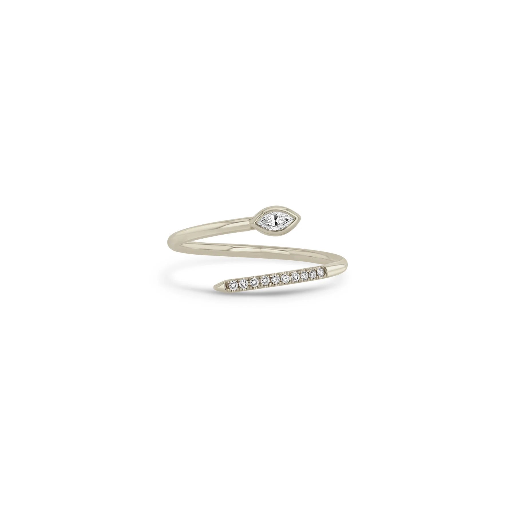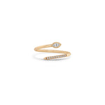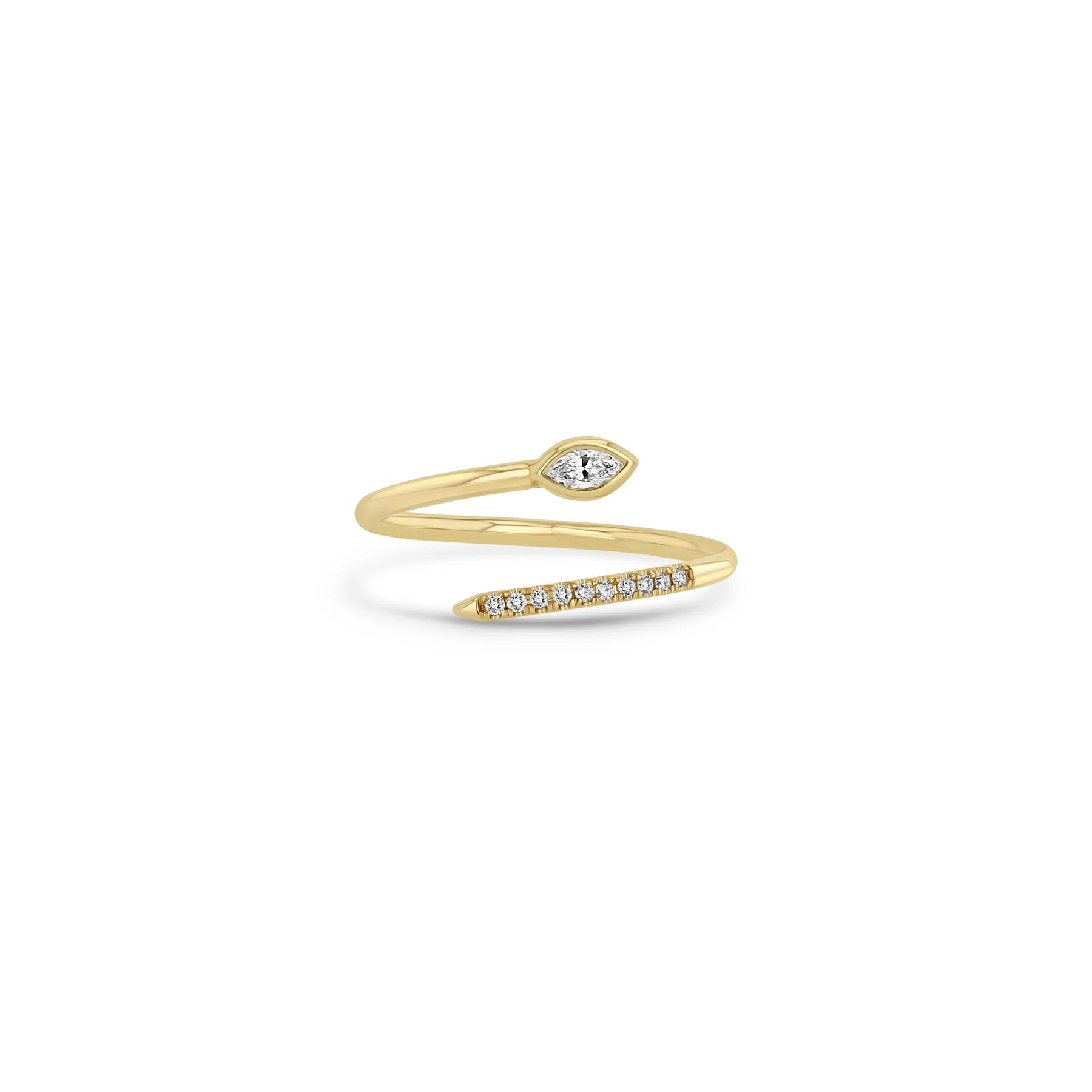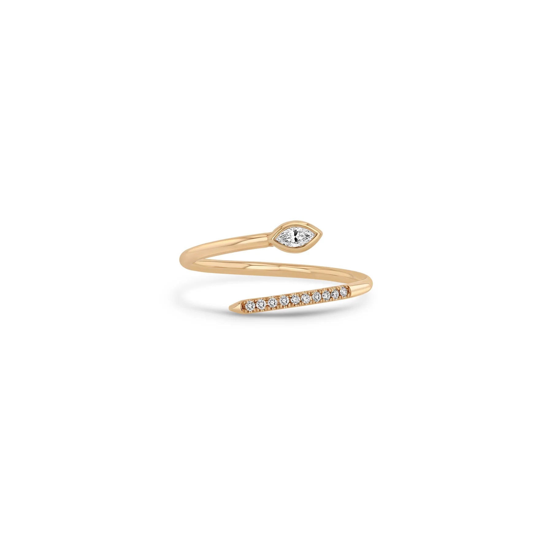 14k gold bypass wrap ring with ten french set pavé white diamonds on one side and a horizontal bezel set marquise diamond on the other