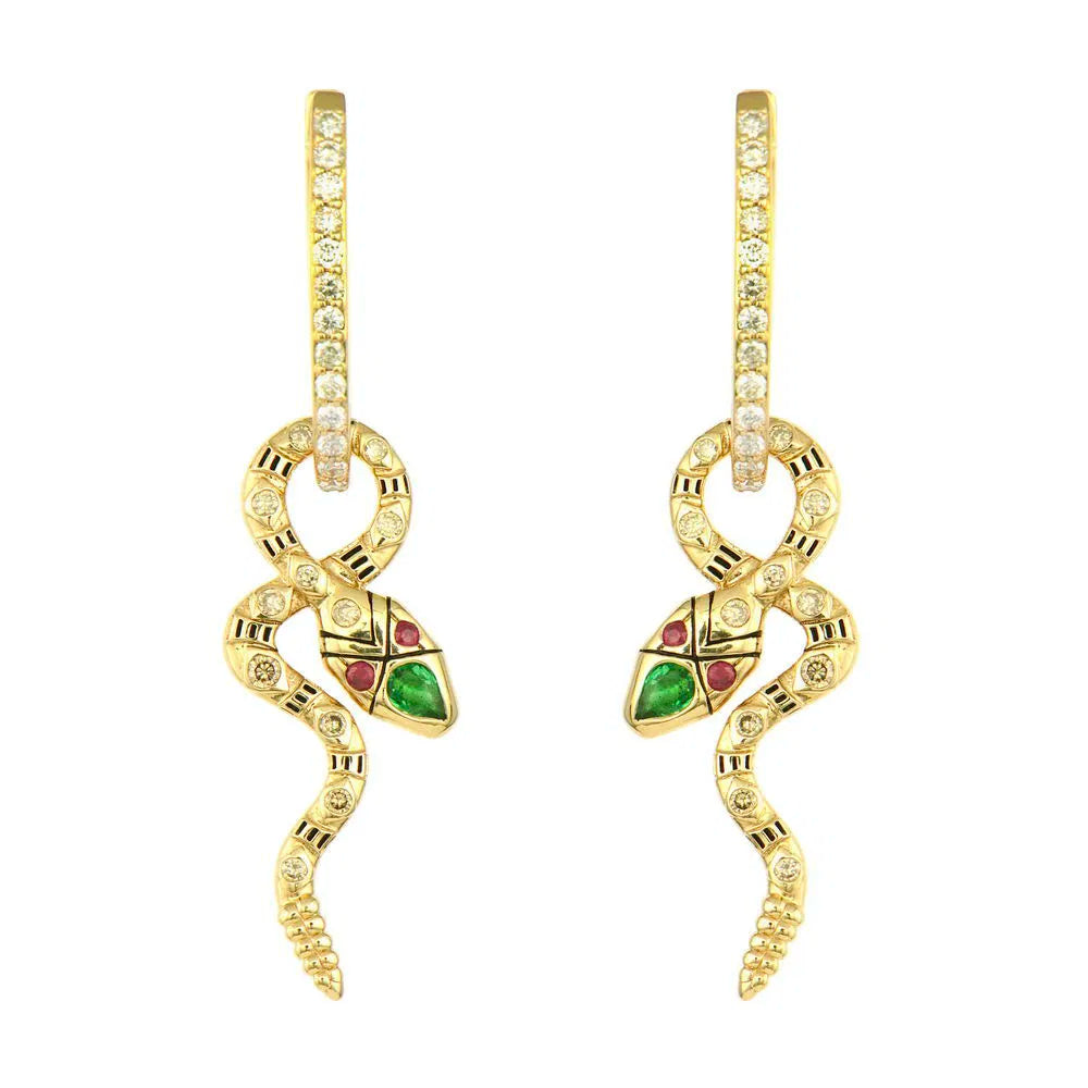 This Double Sided Coiled Snake Charm captures serpentine elegance in exquisite detail. Crafted in 14K gold, this intricate piece features a coiled snake design with two distinct personalities. One side sparkles with diamonds, including a pear-shaped diamond adorning the snake's head. Flip it over to reveal champagne diamonds and rubies with a pear-shaped emerald gracing the head, creating a rich, earthy palette.