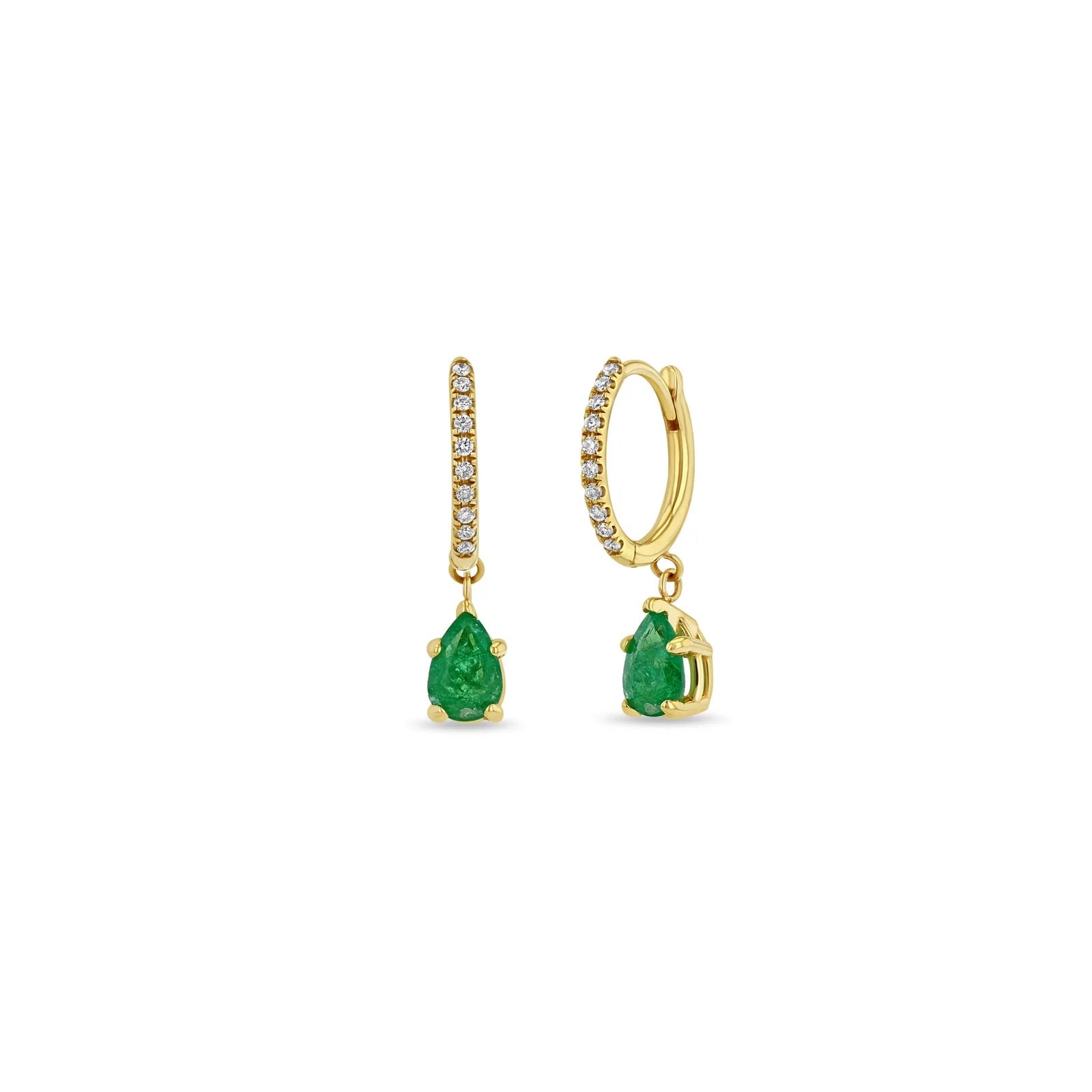 Small Pave Diamond Hinge Huggie Hoops with Pear Emeralds