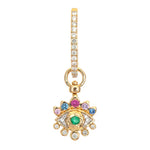 Feel the protection of the evil eye... The Single Bejeweled Evil Eye Top Switch Charm is a stunning combination of 14k yellow gold, diamonds, emerald, ruby and sapphire. These charms showcase the Three Stories top switch mechanism that allow you to rotate the jump ring so the charm is multi-functional and can be worn as an earring on hoops or as a pendant on a chain necklace or bracelet without skipping a beat.