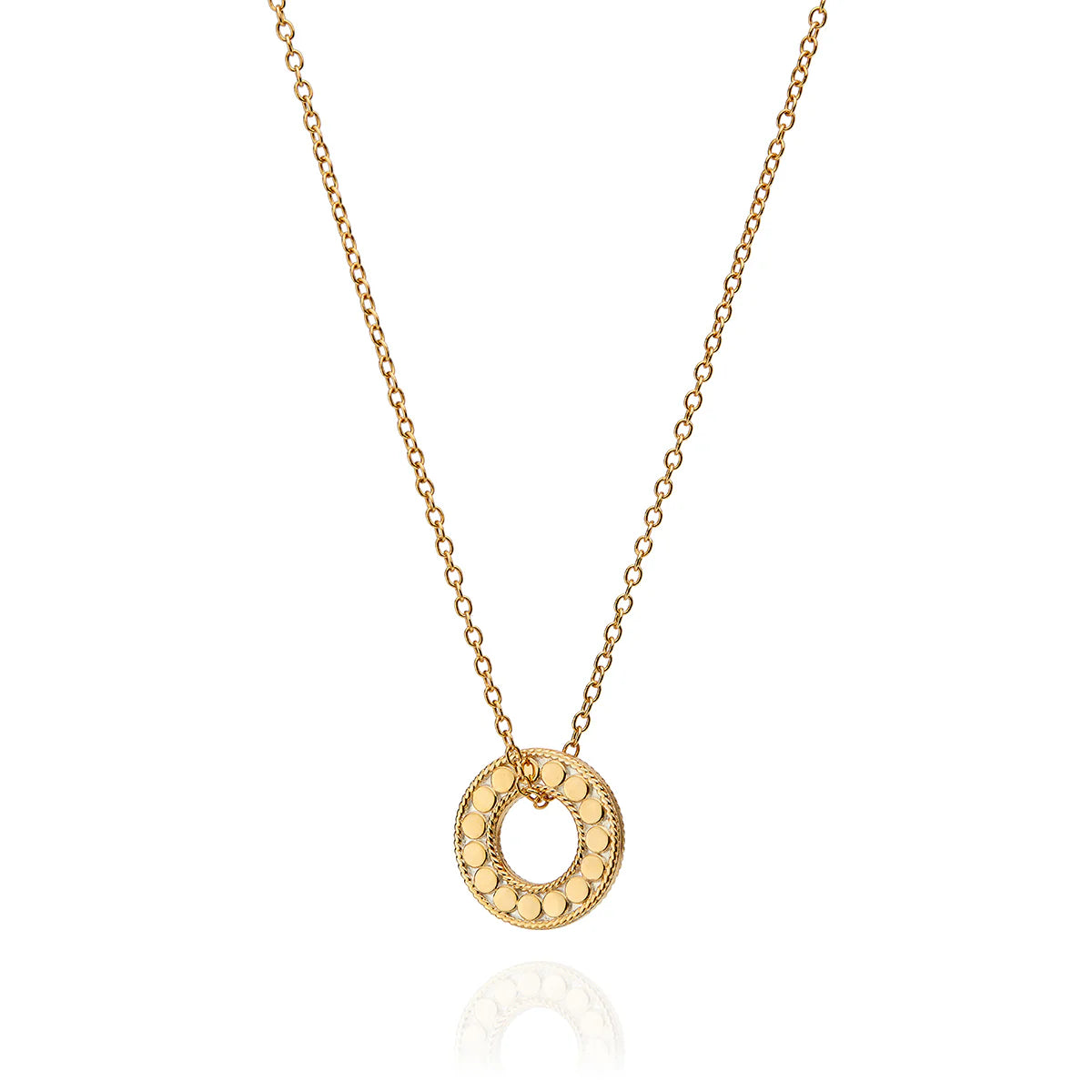 Our Turquoise Pavé Open Circle Necklace is adorned with vibrant, pavé set turquoise stones. Flip the pendant to reveal a finished back with our signature dotted texture. A portion of proceeds benefit Bumi Sehat, providing safe and healthy births in Indonesia.