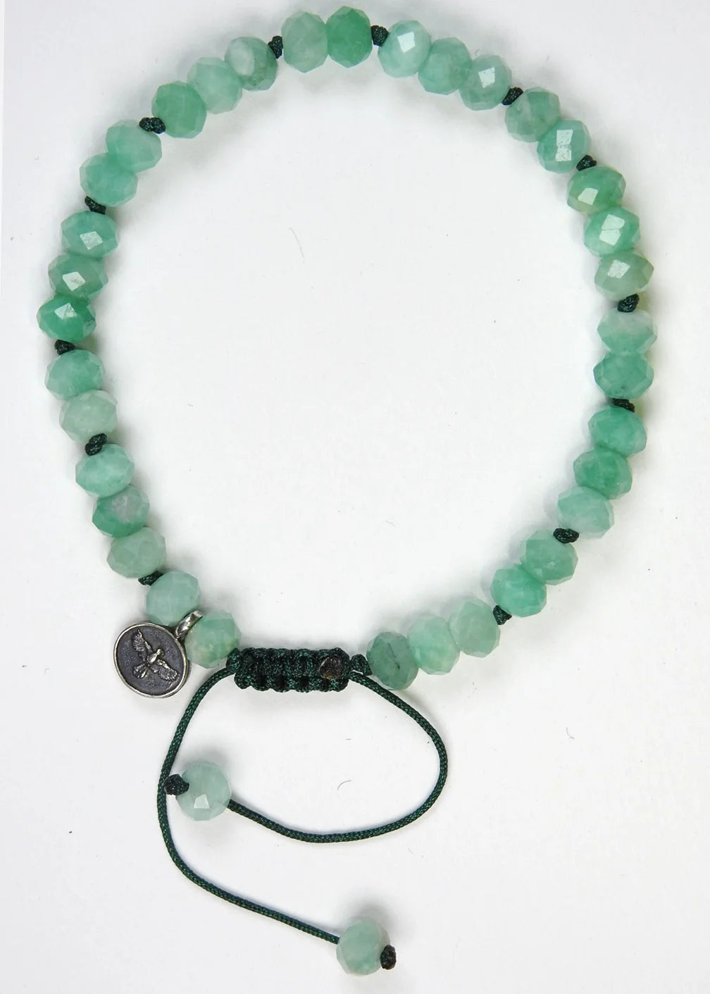 Natural translucent pale green Emerald stones from Zambia, cut into 6mm faceted rondelles on a hand-knotted adjustable cord bracelet