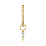This Small Sari Dagger Charm offers an elegant, sleek design in 14K yellow gold. Featuring two prong-set diamonds that create a subtle yet striking dagger-like silhouette, this charm combines simplicity with sophistication. The diamonds catch the light beautifully, adding just the right amount of sparkle to this refined piece. This sparkling gold charm can be worn on Three Stories hoop earrings or added to a chain bracelet or necklace by adding an openable pendant bale. Hoops and charms sold separately.